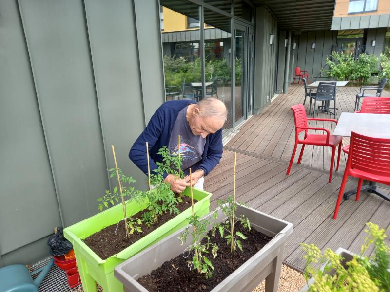 Quelques résidents ont participé au fleurissement de la Résidence avec l’aide de Marie-Laure, aide-soignante. Ils ont plantés de la menthe, des tomates cerises et des pois de senteur qu’ils avaient fait pousser.